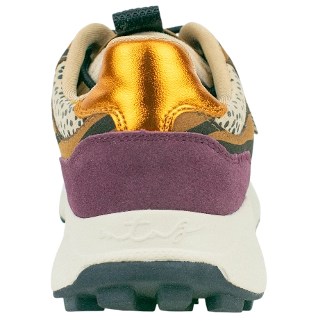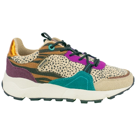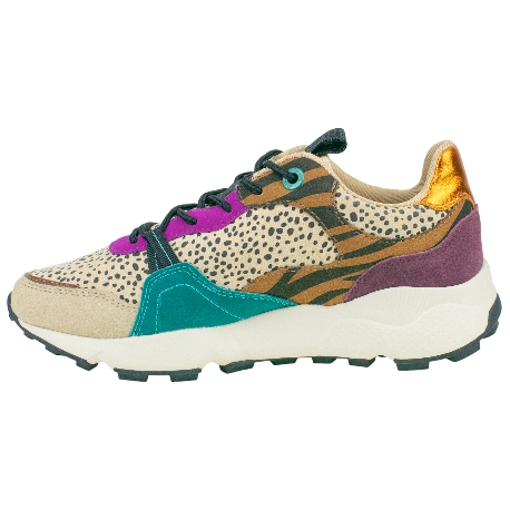 Zapatillas cómodas y de estética única, combinan paneles de materiales y telas, con estampados animales, verdes, naranjas y violetas.