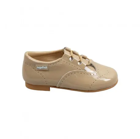 A destacar de su plantilla es el ligero arco en el pie que aporta mayor comodidad a sus piecitos. Tacón de 0.5cm., cierre de cordones. Disponible en color azul marino(muy oscuro) y beige.