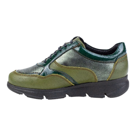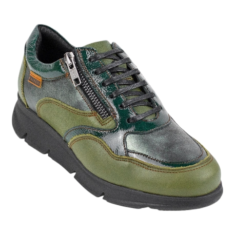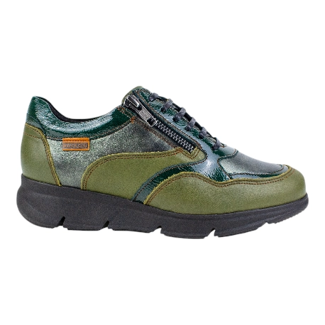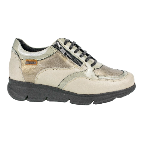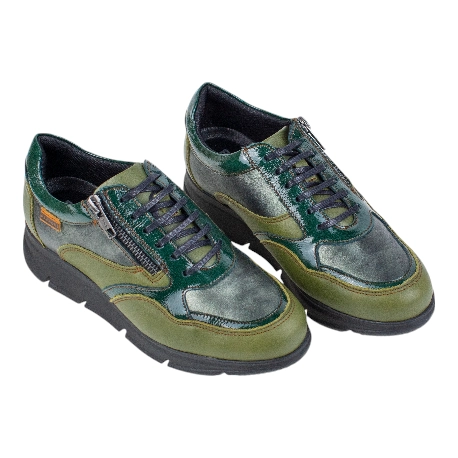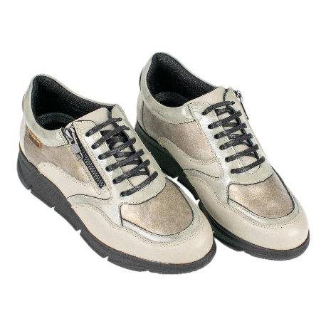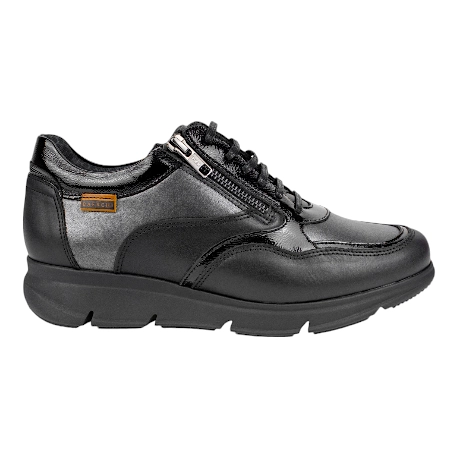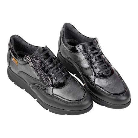 Zapatos Ancho Especial Modernos y Comodos fabricados en piel color gris con detalles en charol. Cierre de cordones y cremallera metálica para un ajuste personalizado.
