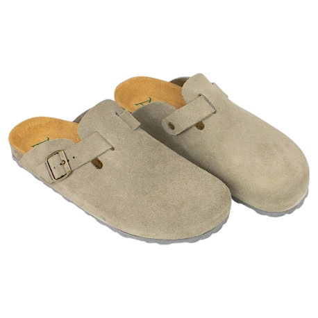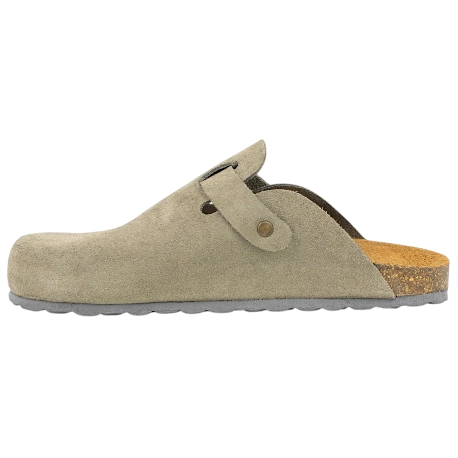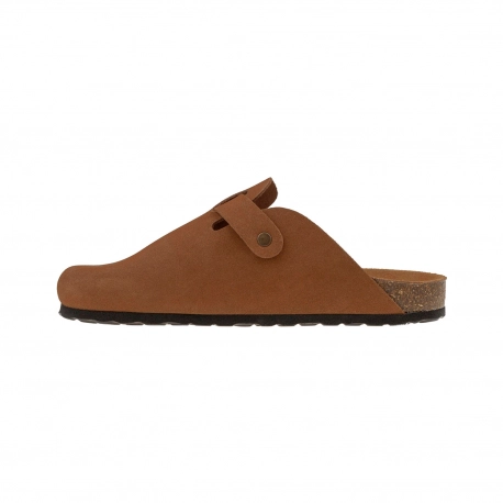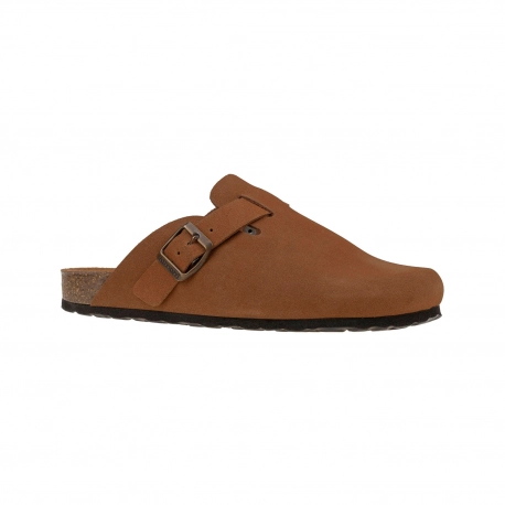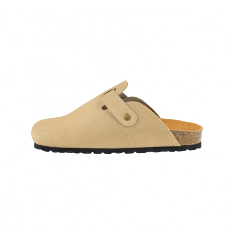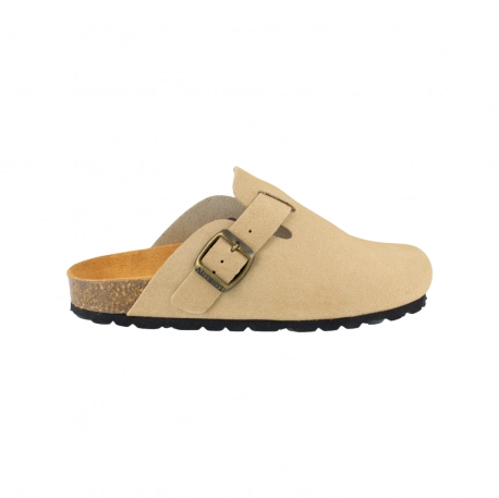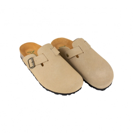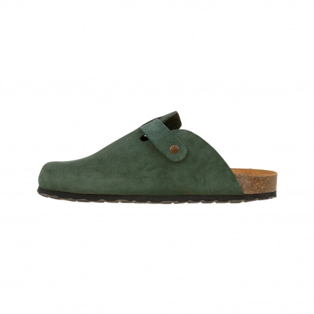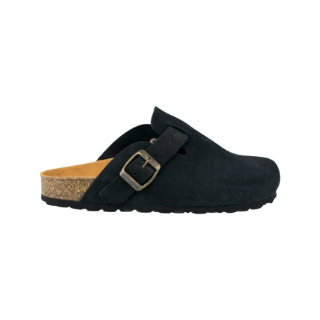 Sandalia bio estilo zueco fabricado en piel (seraje) color negro, verde y marrón, con hebilla ajustable para adaptarlo mejor. Plantilla anatómica con acolchado Soft carbónico, muy cómodas. Planta de corcho natural antibacteriano.