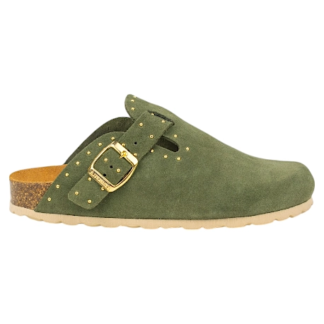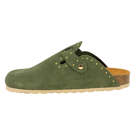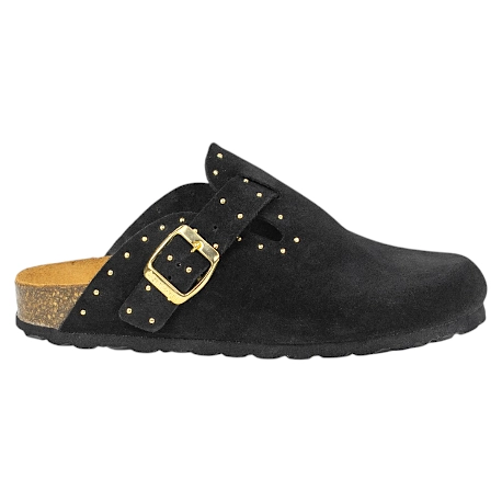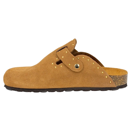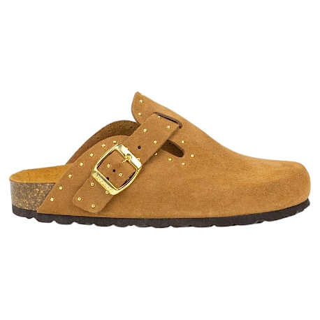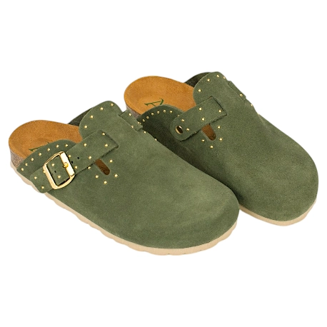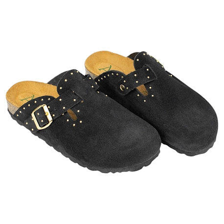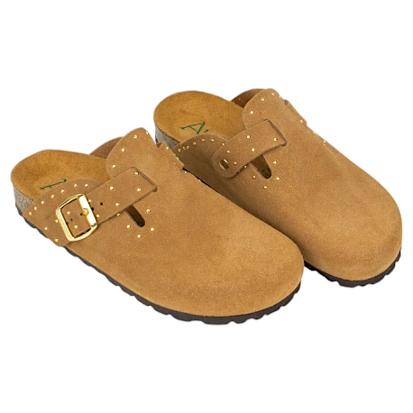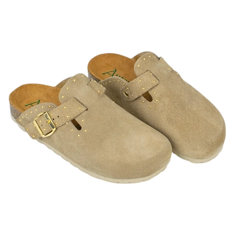 Zuecos fabricados enteramente en piel serraje de primera calidad, combinan el diseño clásico de este calzado con tachas doradas decorativas que le dan un toque más moderno .