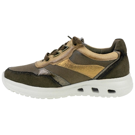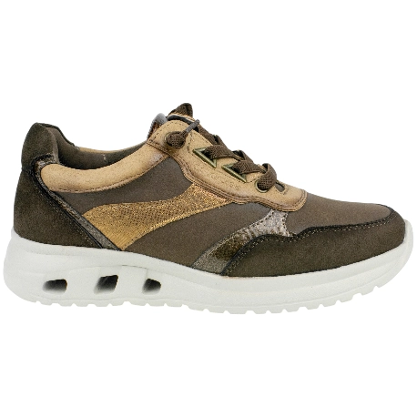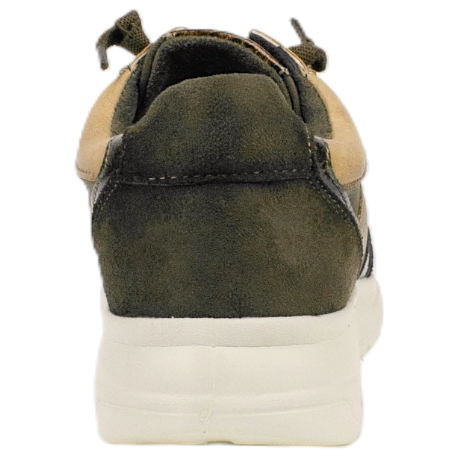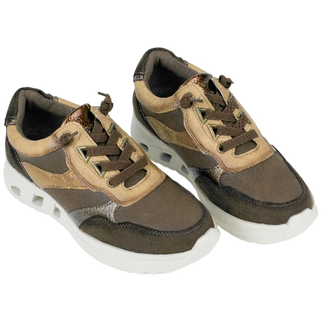 Zapatilla cómodas para vestir, fabricada con paneles textiles y sintéticos, en tonos marrón.